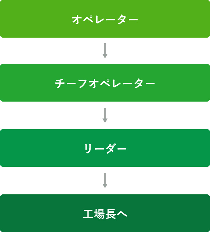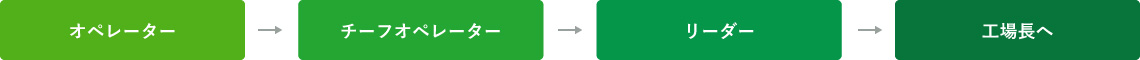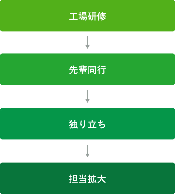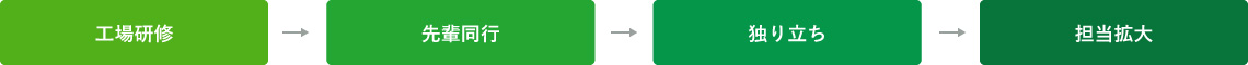 | 製造部: | 入社から約3カ月間は、先輩社員がマンツーマンで指導。業務への習熟度をお互いに確認しながら、守備範囲を広げていきます。 |